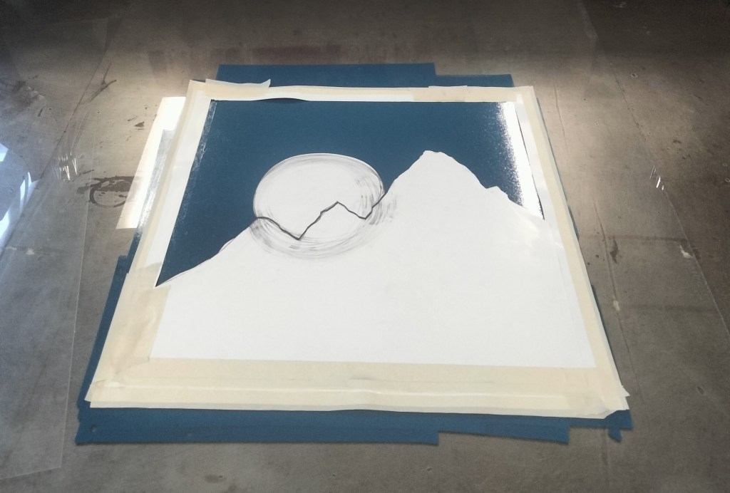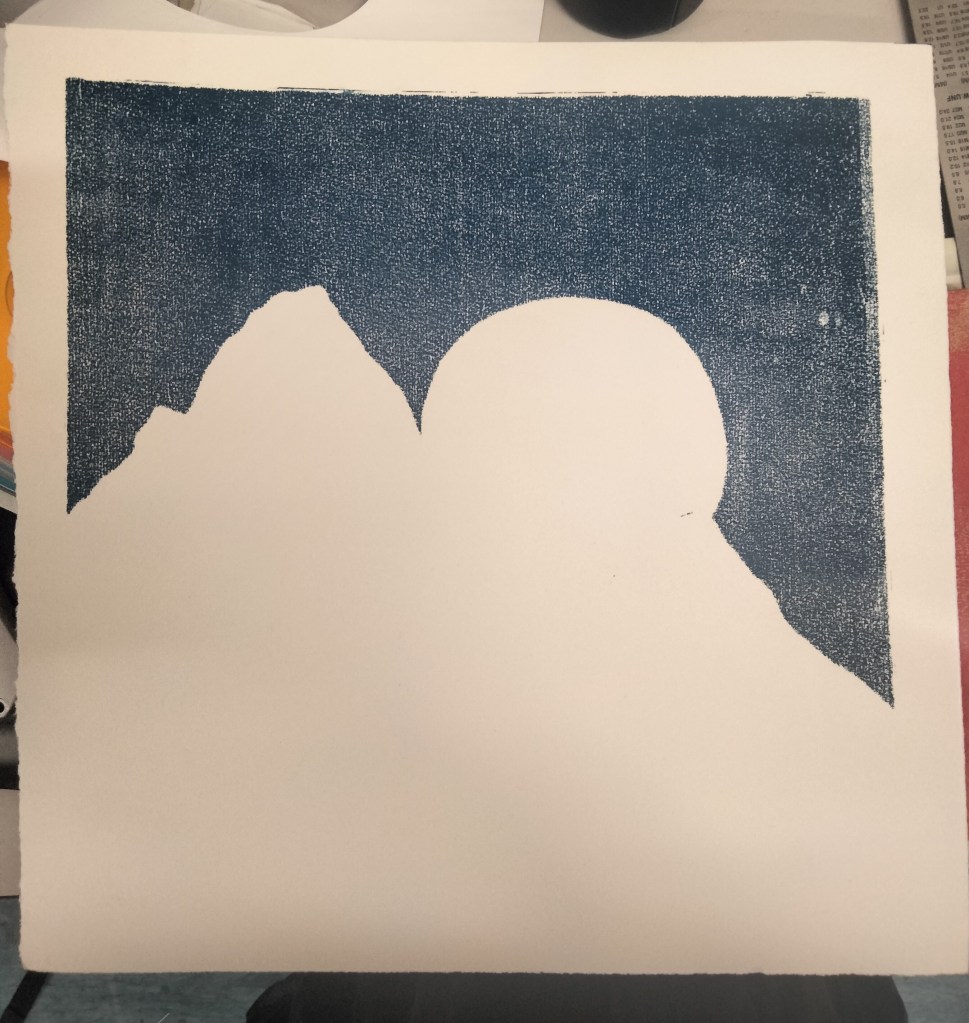My first monoprint experiment was planned out to be a three colour print with grey mountains in the foreground, a red sun in the midground and a blue sky for the background. I was inspired by Bauhaus artists such as Kandinsky with their sleek, clean lines and use of primary colours. My goal for this print was to create a clean, solid colour landscape. I rolled out a combination of blue, white and black ink to form a middle dark blue sky colour. My sun, mountain and border stencil was lay down and I pressed my first layer.