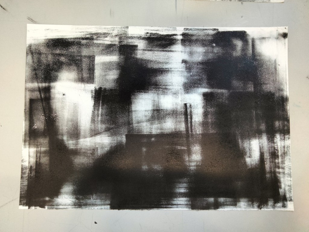 I struggled with replicating the streaky marks across the whole perspex as I rolled up the ink. With the black ink I found it to roll out in larger splotches rather than purely resisting where the ecowash was. Despite this I was happy with how it turned out and will add another layer in red with stencils to refine the print.