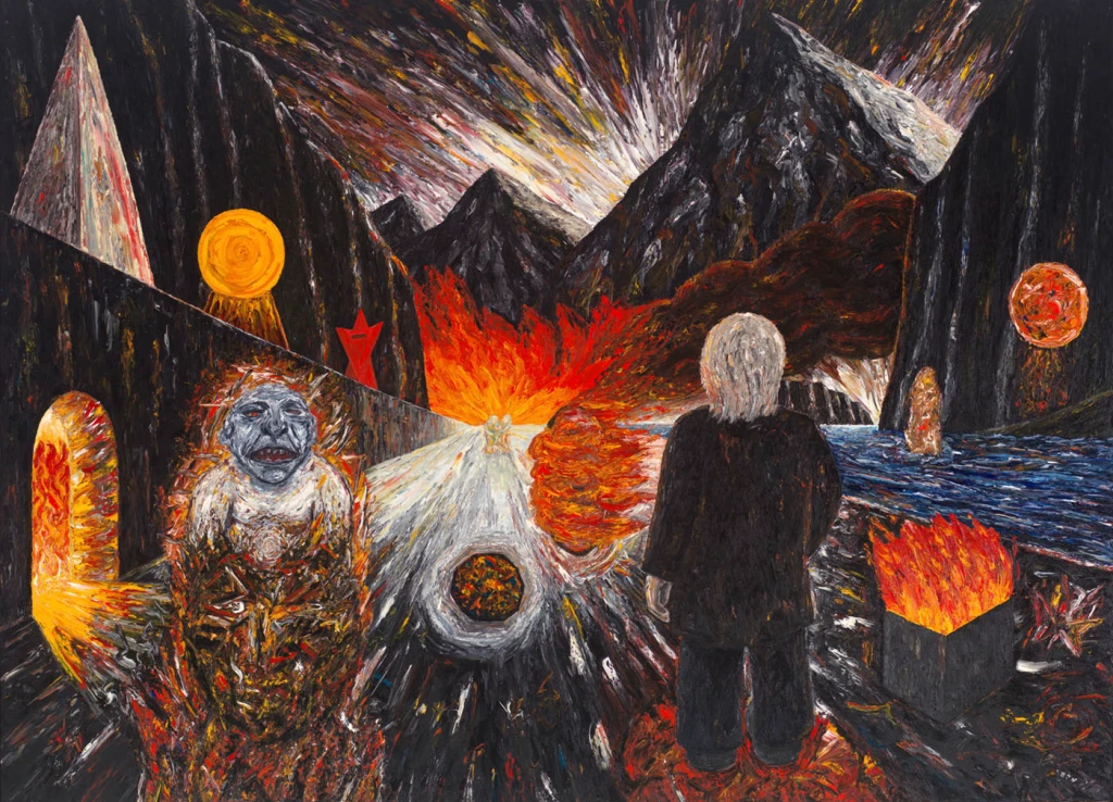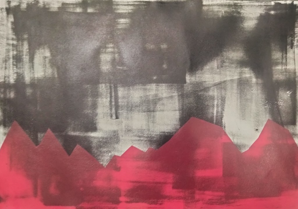 My second backdrop had a more abstract quality to it with it’s large rectangular patches of black. I thus chose to also make the mountains in the foreground unrealistic. Inspired by Nigel Godrich’s album cover for Radiohead’s album Kid A and it’s triangular mountains, I cut out my yupo stencil in a similar fashion. I chose to print the mountains in red as it would contrast against the black backdrop to hopefully generate a foreboding atmosphere. The overall intended atmosphere of the print was to be similar in vein to Peter Booth’s dramatic Painting (1978), which similarly utilises a red colour palette and sharp, triangular mountains.