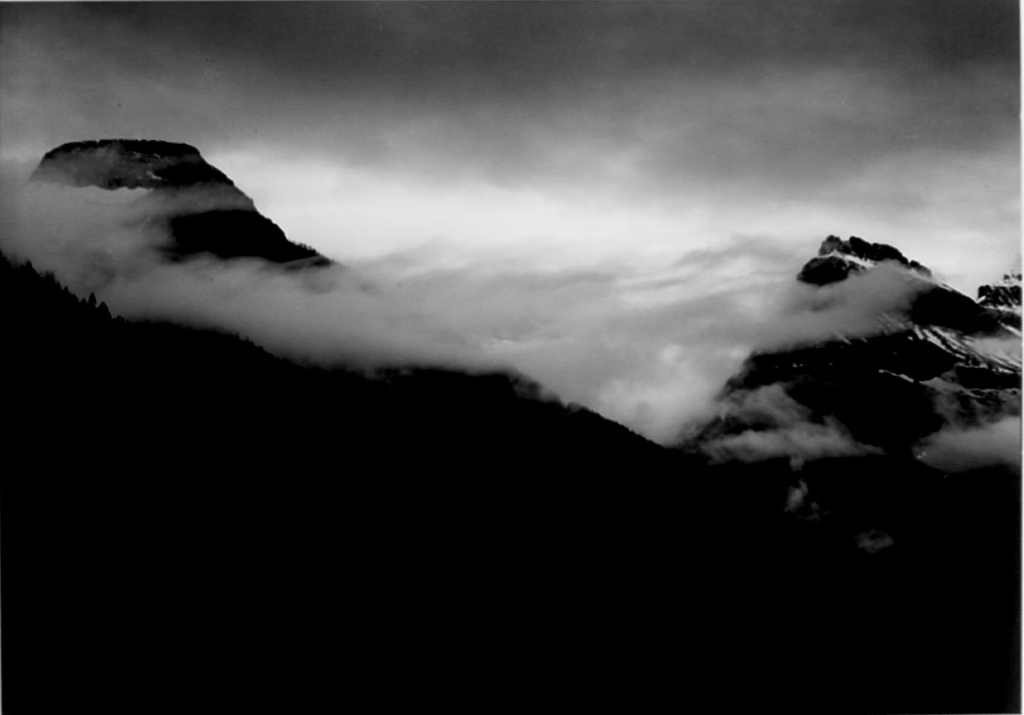 I cut out a stencil with yupo paper for the mountain silhouette. This layer was to be printed in a solid black to contrast the hazy background, adding depth to the image. Ansel Adams atmospheric landscape photography inspired me for this print due to his balanced monochrome tones and realist landscape depiction.