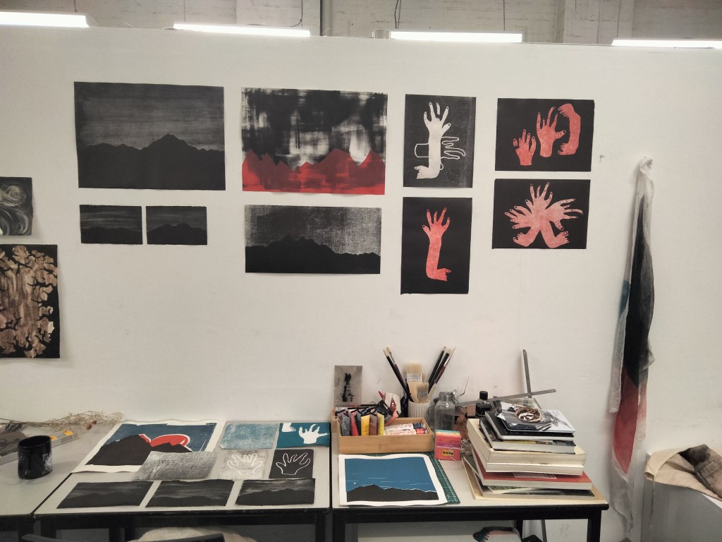 I chose not to incorporate the three colour piece I created that was discussed in my first blog (seen in top left of the table in the image above). Adding extra colour layers to the work ended up difficult due to the registration of a border along with the three layers. The final piece ended up not as clean as I had originally envisioned. The other landscapes also aesthetically matched better with their dark and moody atmosphere.