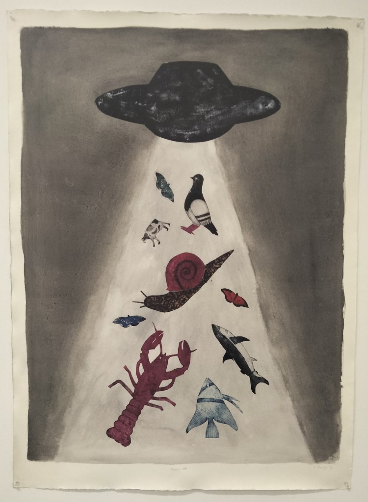 I inked up each collagraph plate and placed them on a registration sheet that was created to line up with the background of the print. I flipped some of the animals upside down and on their side to create a comedic tone and to give the sensation they are being sucked up into the UFO. The UFO originally printed as pure-black despite selectively rubbing down sections to make them lighter after inking. I corrected this by ghost printing a layer of white softly on-top to add tone and texture to match with the rest of the print.