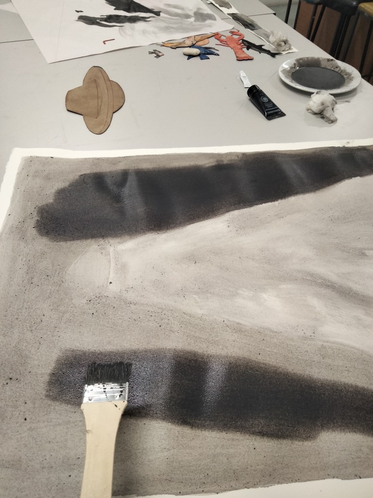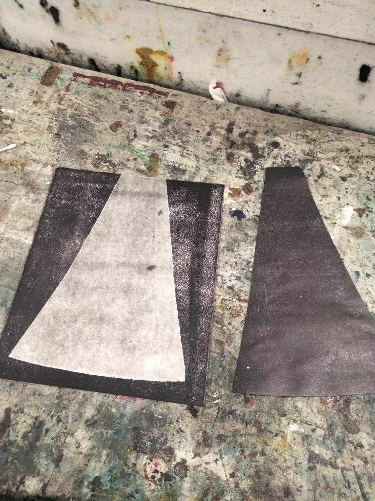 I first experimented with creating a background for my UFO print with monoprint. I set the press light to allow a noisy, textured black background to print. A paper stencil masking out the light of the UFO was placed over and then inked up and hand printed on top as a ghost print. This allowed the light to still have tonality to it while being lighter than the surrounding night sky. I liked the result of this as it matched the rough aesthetic of my plates, but it seemed difficult to control. As my final print will be very large, I chose to instead paint the backdrop.