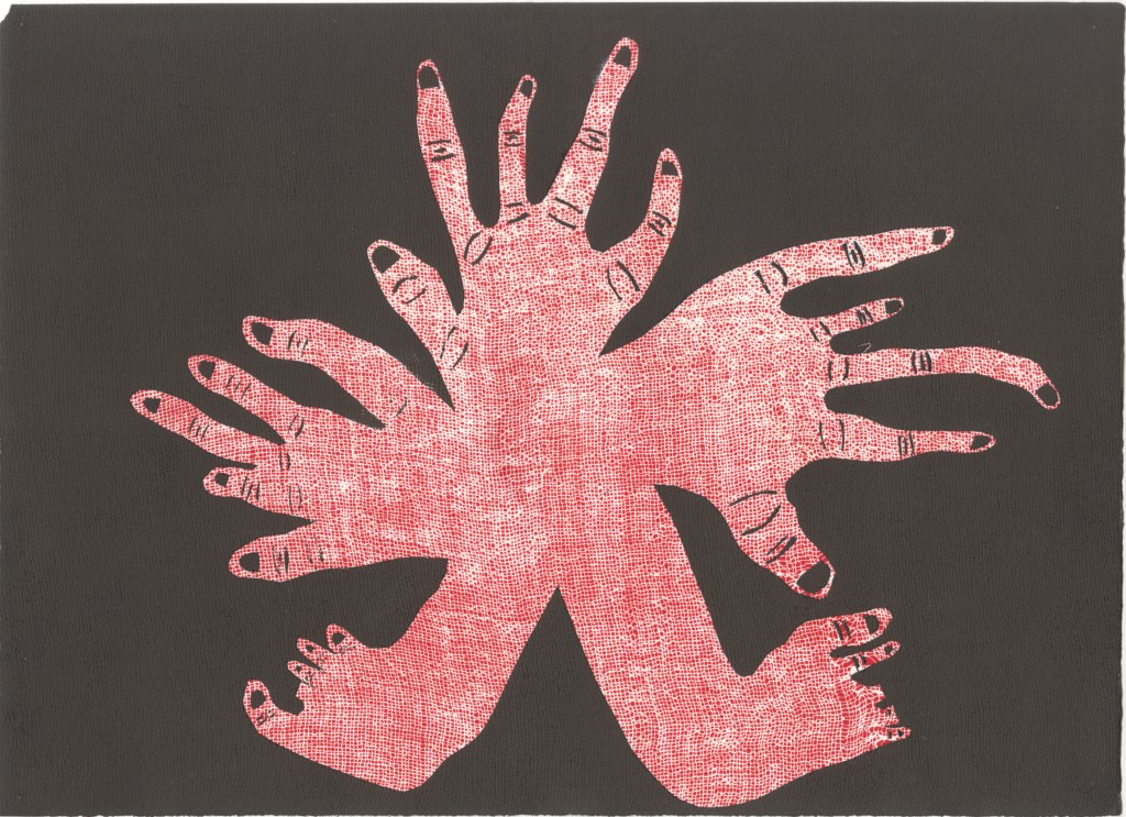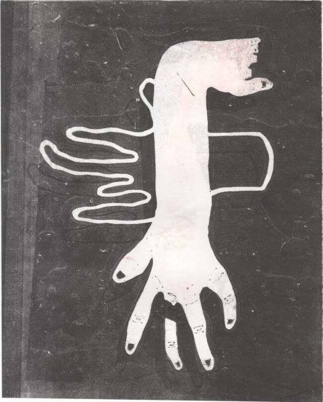 Using yupo I cut out body part stencils. I also cut out outlines to be able to create layered background effects and further experiment with forms as shown in the background of this image. This print I ghost printed the background to add texture and an ethereal space-like aesthetic to the piece. The foot and hand were separate stencils I placed together when printing. Separating each body part allowed me to create different compositions of body parts with the same stencils as shown below.